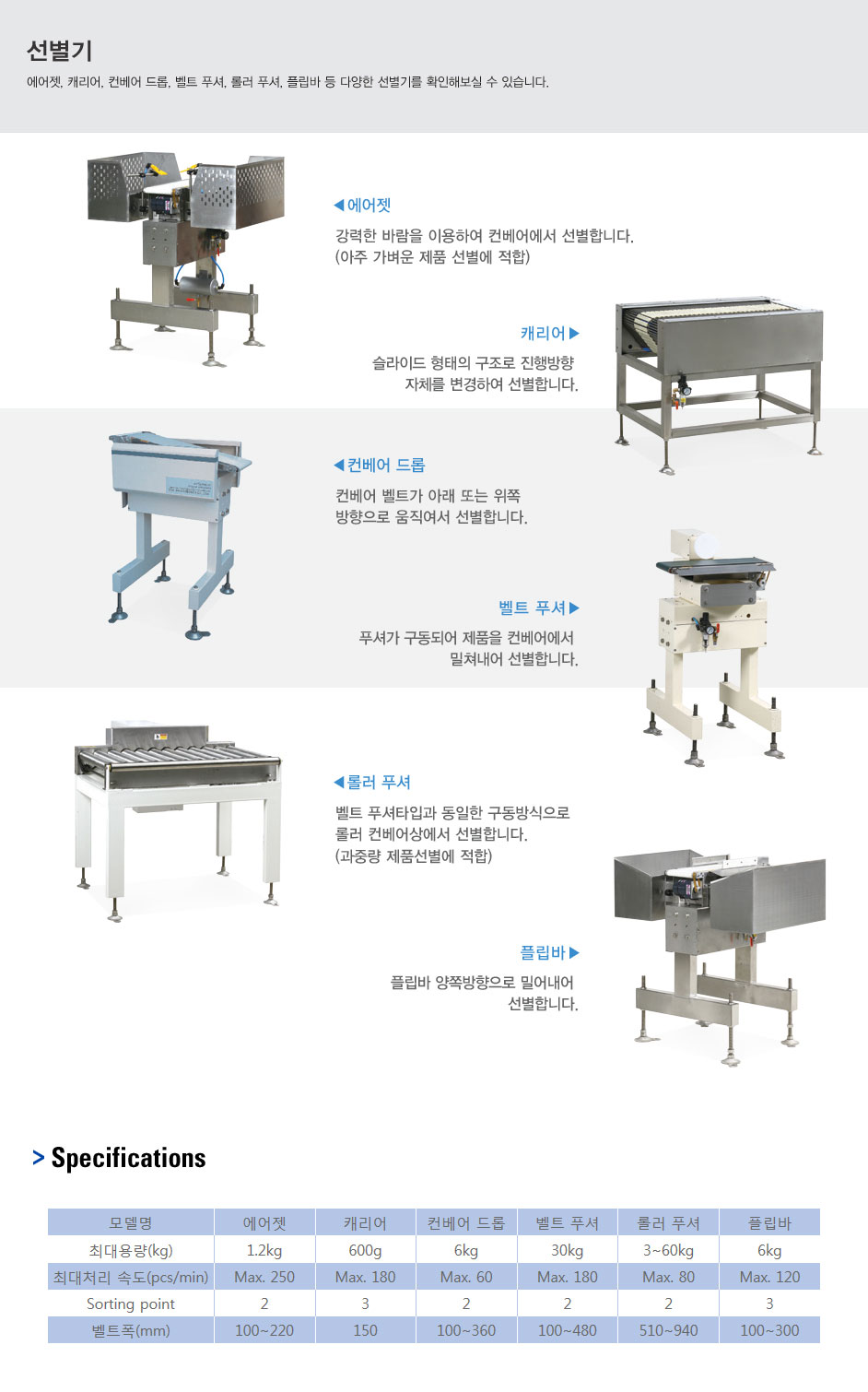 다양한 타입의 선별기를 만나보실 수 있습니다. 에어젯 / 캐리어 / 컨베어 드롭 / 벨트 푸셔 / 롤러 푸셔 / 플립바