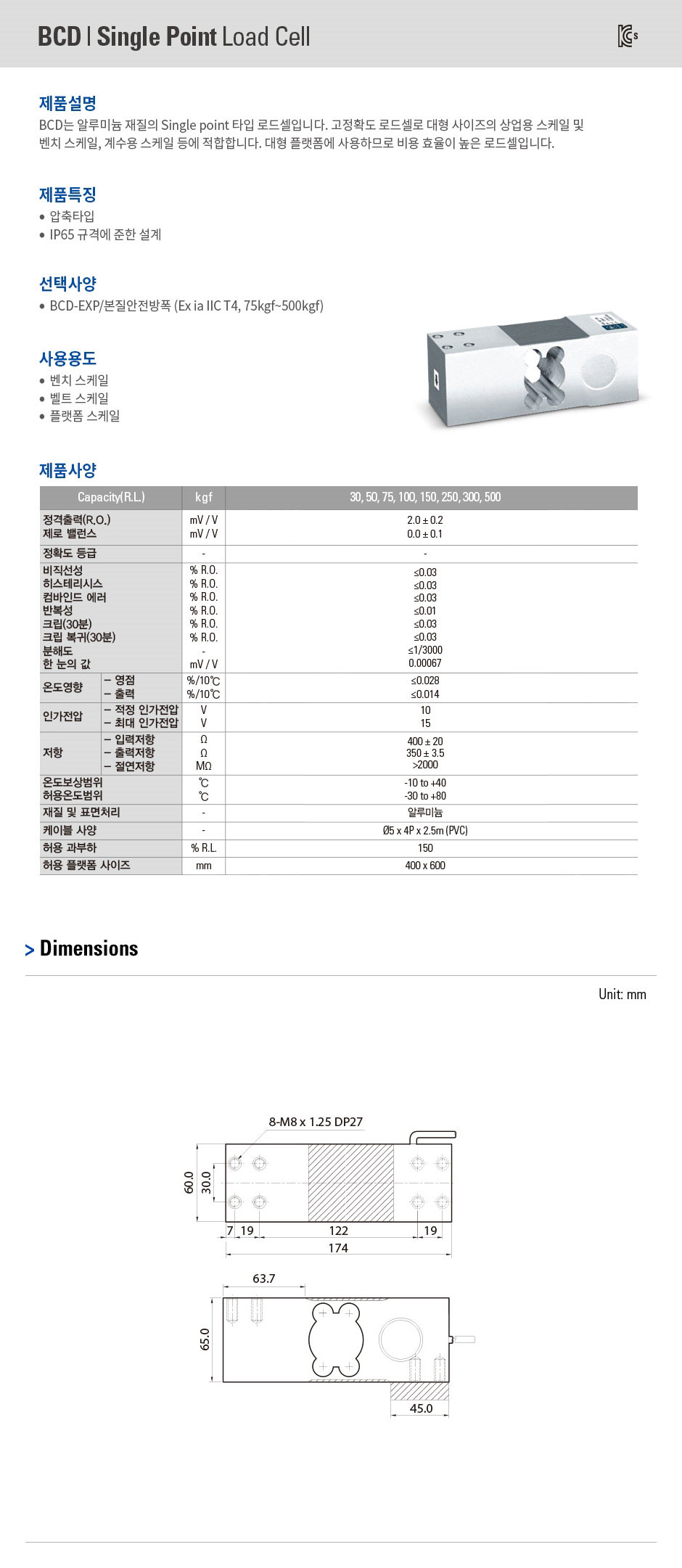 알루미늄 재질의 Single point 타입 로드셀
