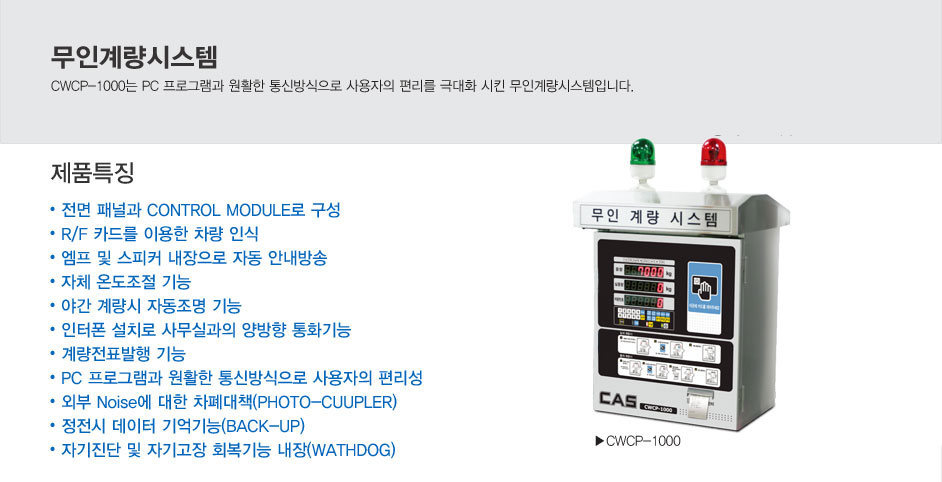 CWCP-1000는 PC 프로그램과 원활한 통신방식으로 사용자의 편리를 극대화 시킨 무인계량시스템입니다.