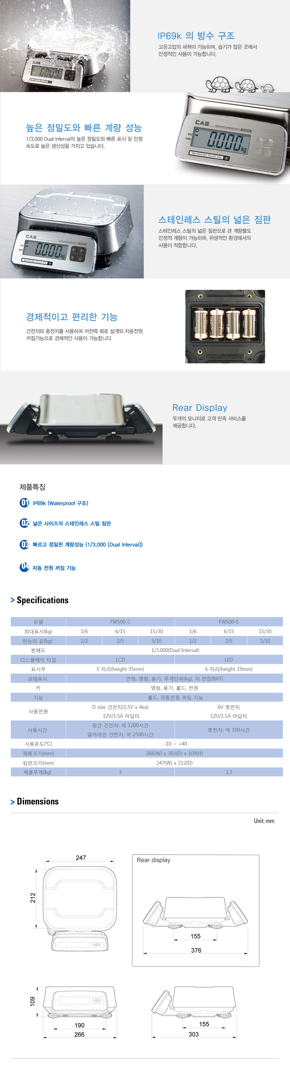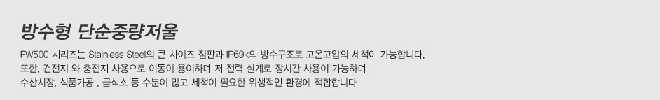 FW500 시리즈는 Stainless Steel의 큰 사이즈 짐판과 IP69k의 방수구조로 고온고압의 세척이 가능합니다.