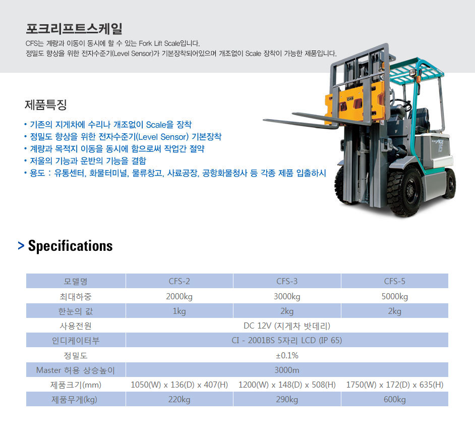 CFS는 계량과 이동이 동시에 할 수 있는 Fork Lift Scale입니다.