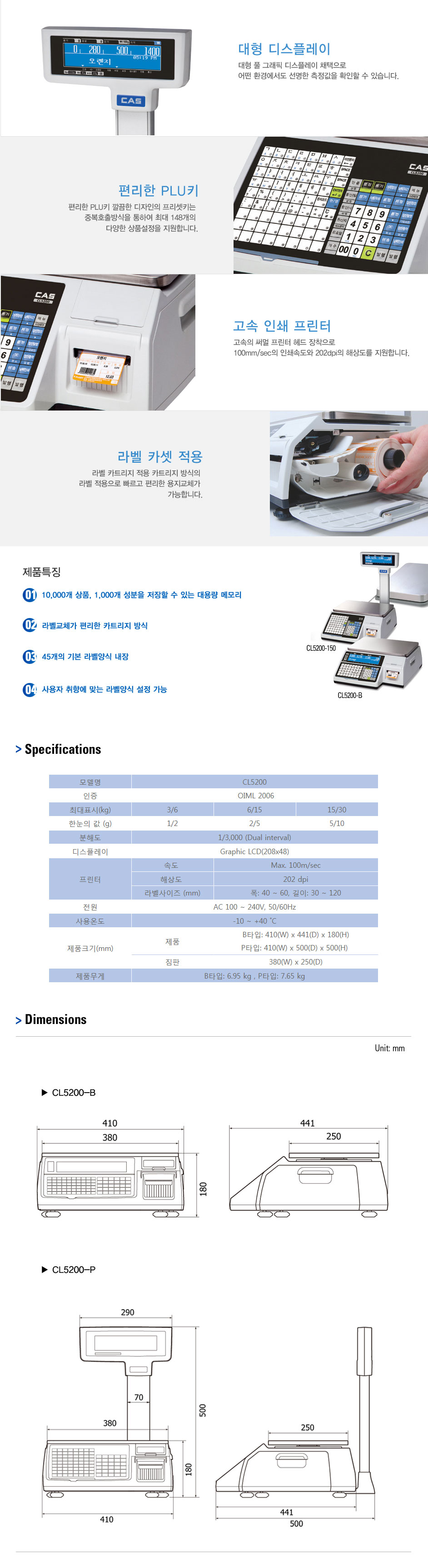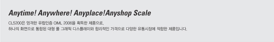 CL5200은 엄격한 유럽인증 OIML 2006을 획득한 제품으로, 하나의 화면으로 통합된 대형 풀 그래픽 디스플레이와 합리적인 가격으로 다양한 유통시장에 적합한 제품입니다.