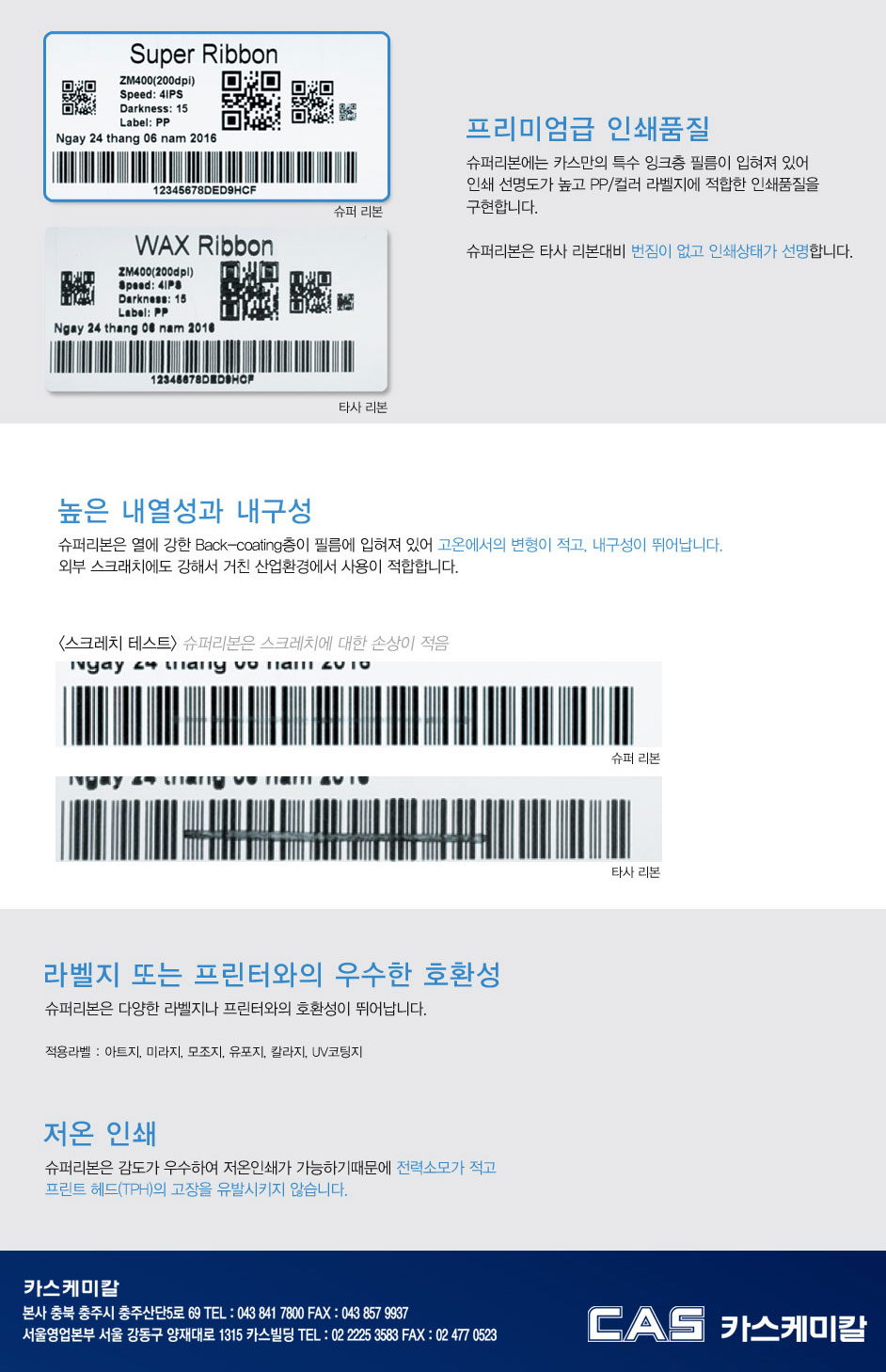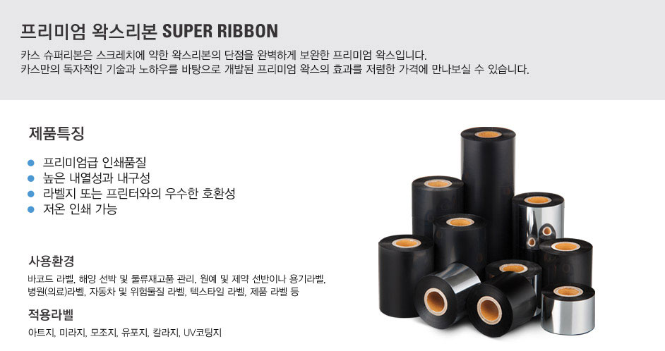 카스 슈퍼리본은 왁스리본의 단점을 완벽하게 보완한 프리미엄 왁스 입니다.
