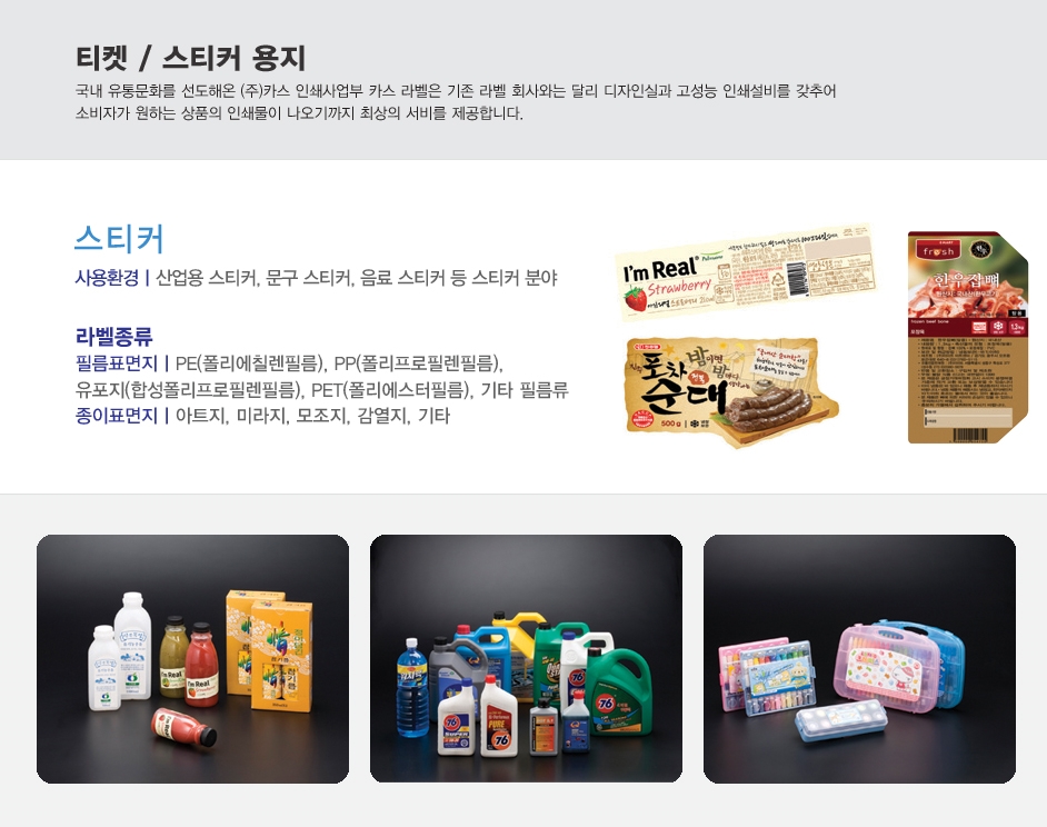 티켓/스티커 용지는 물에 젖거나 찢어지지않고 시간이 지나도 변색되지 않기 때문에 사용환경에 따라 다양한 용지를 선택하여 사용하실 수 있습니다.